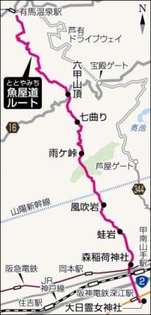 又名「魚屋道」,因從兵庫湊所獲魚類經湯山街道運往有馬溫泉費時失事,故改經六甲山路線運輸因而得名。